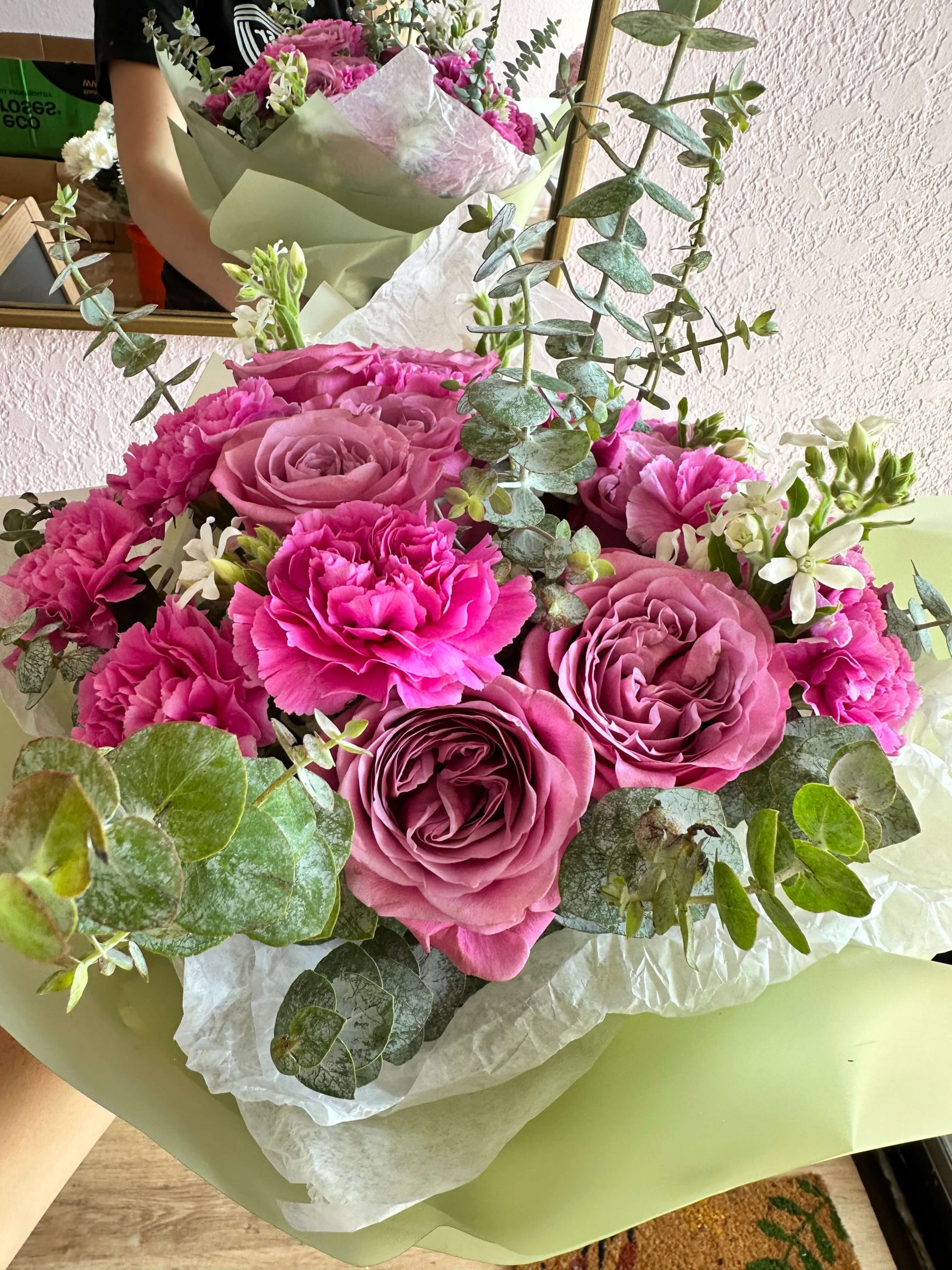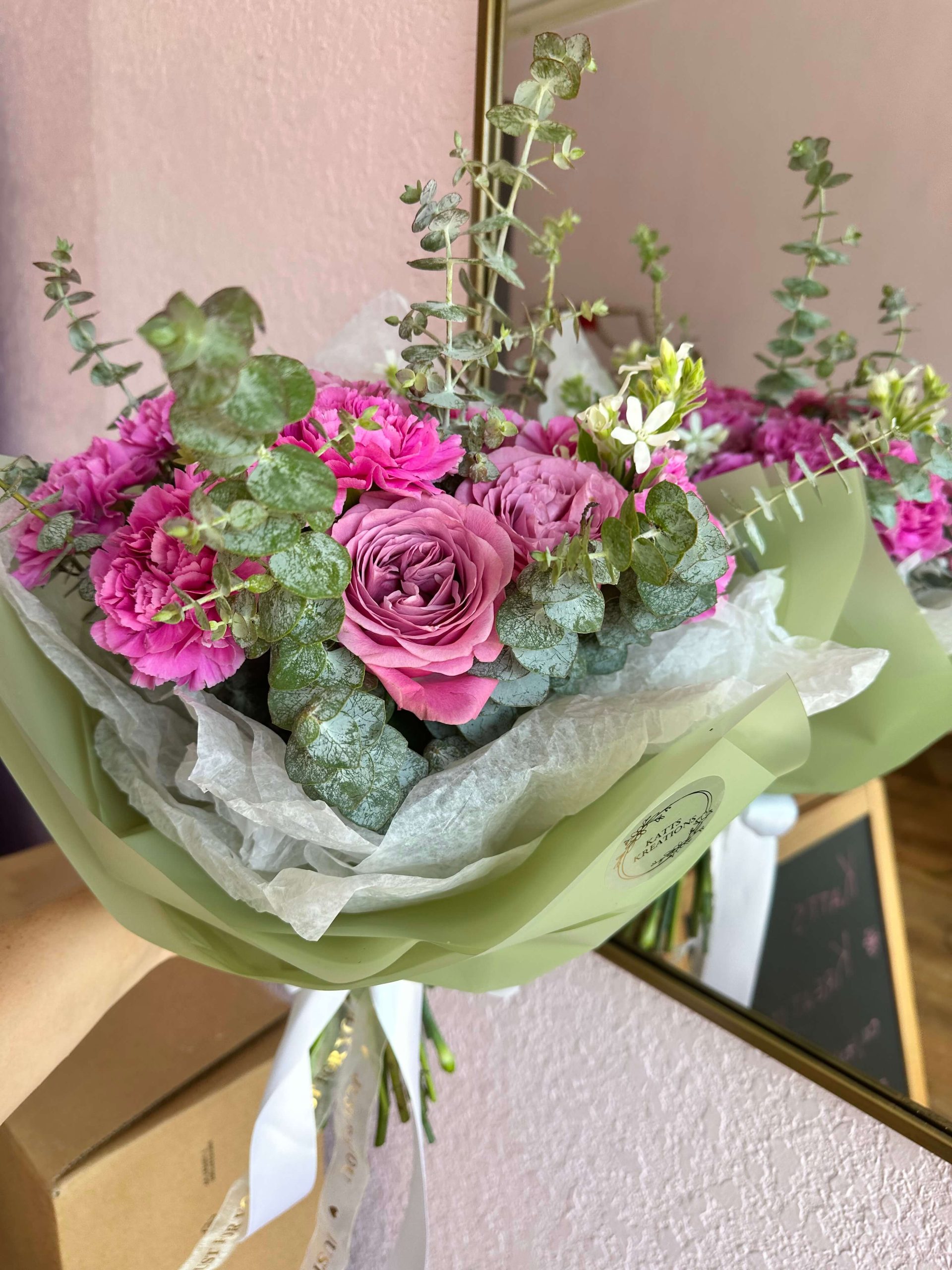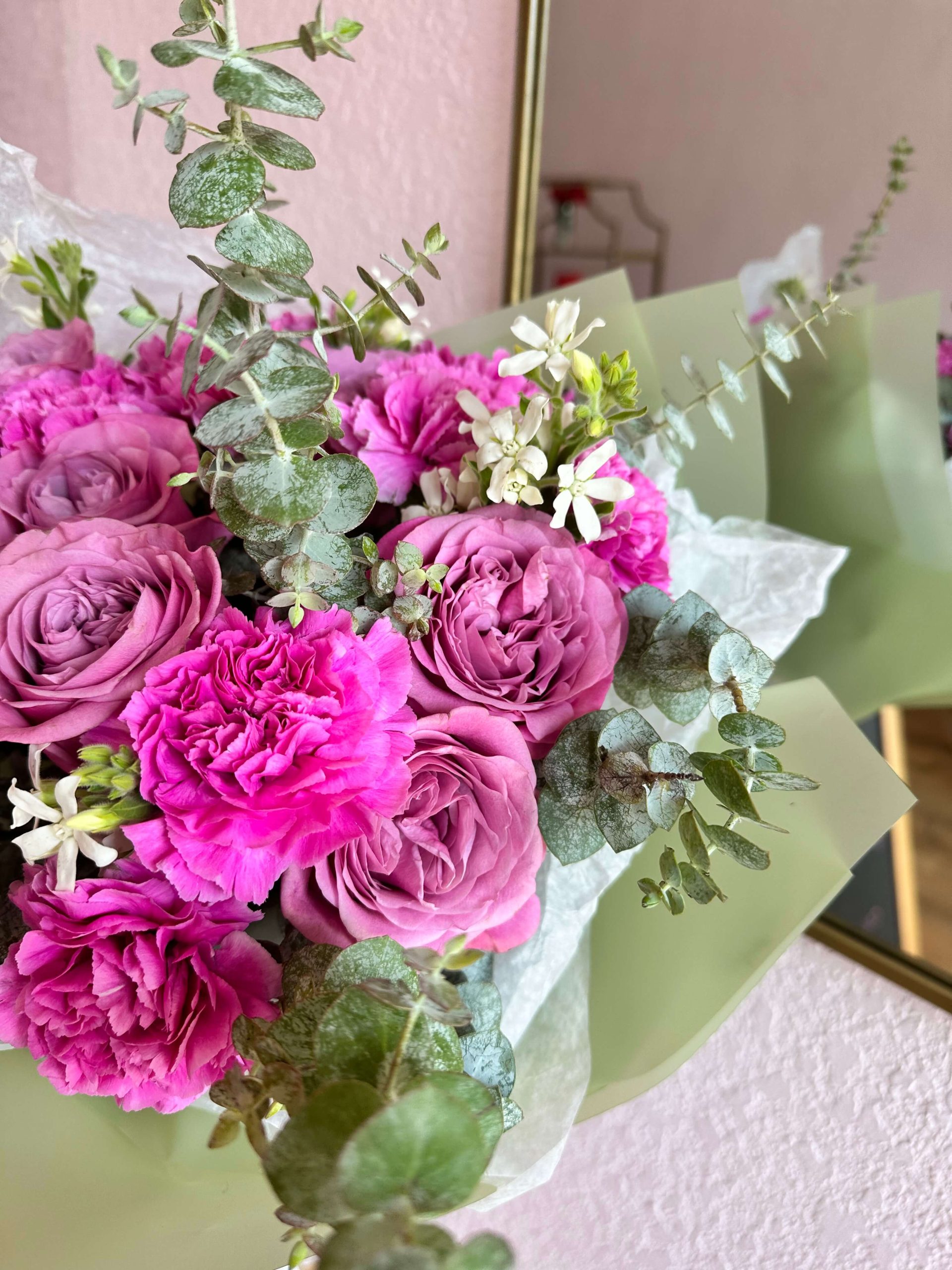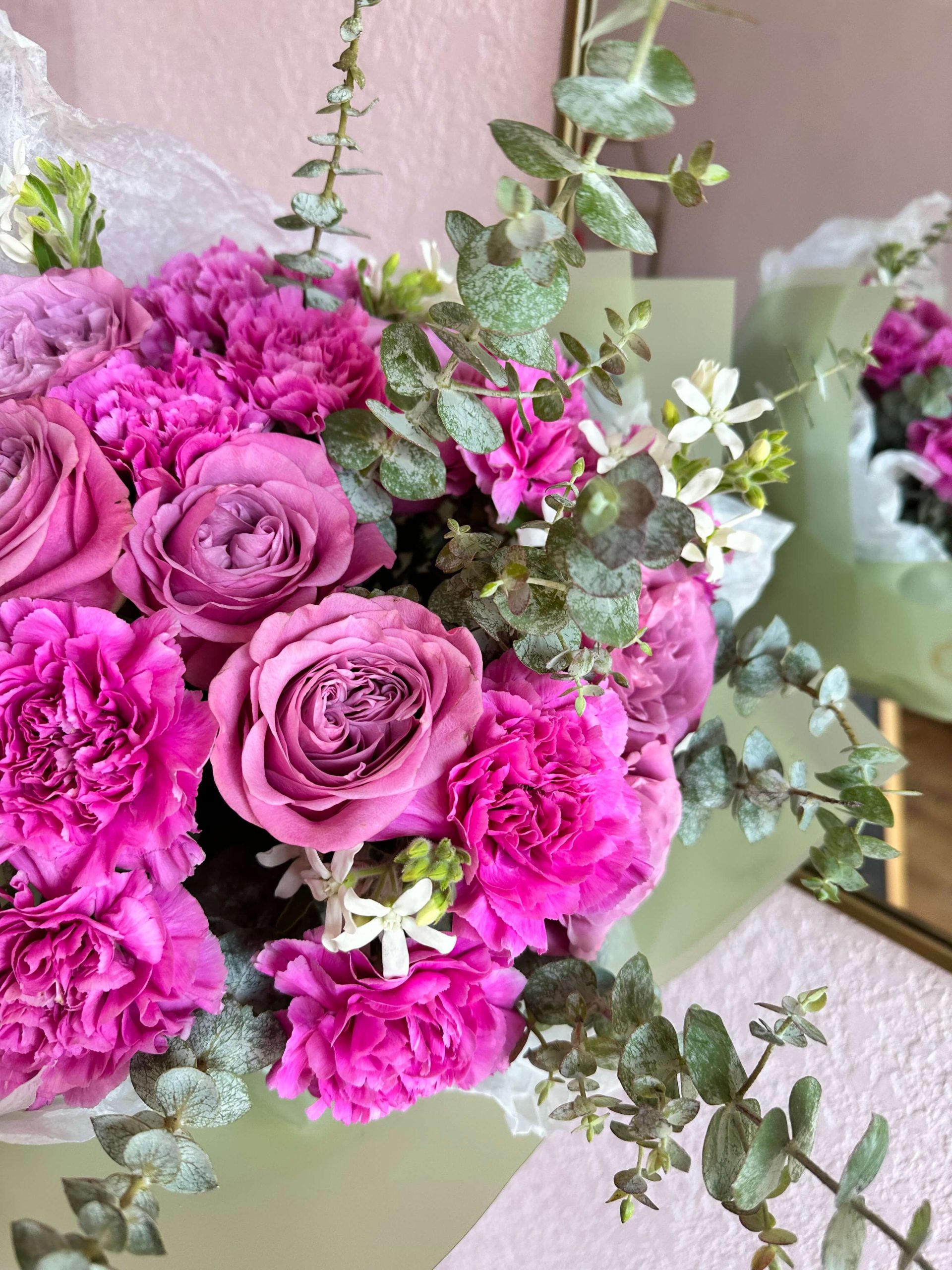 Hot pink carnation mixed with queen lace roses and a hint of eucalyptus. Comes with matching floral paper to complement the bouquet. Perfect gift for a birthday, anniversary, congratulations or a get well. Order yours today!