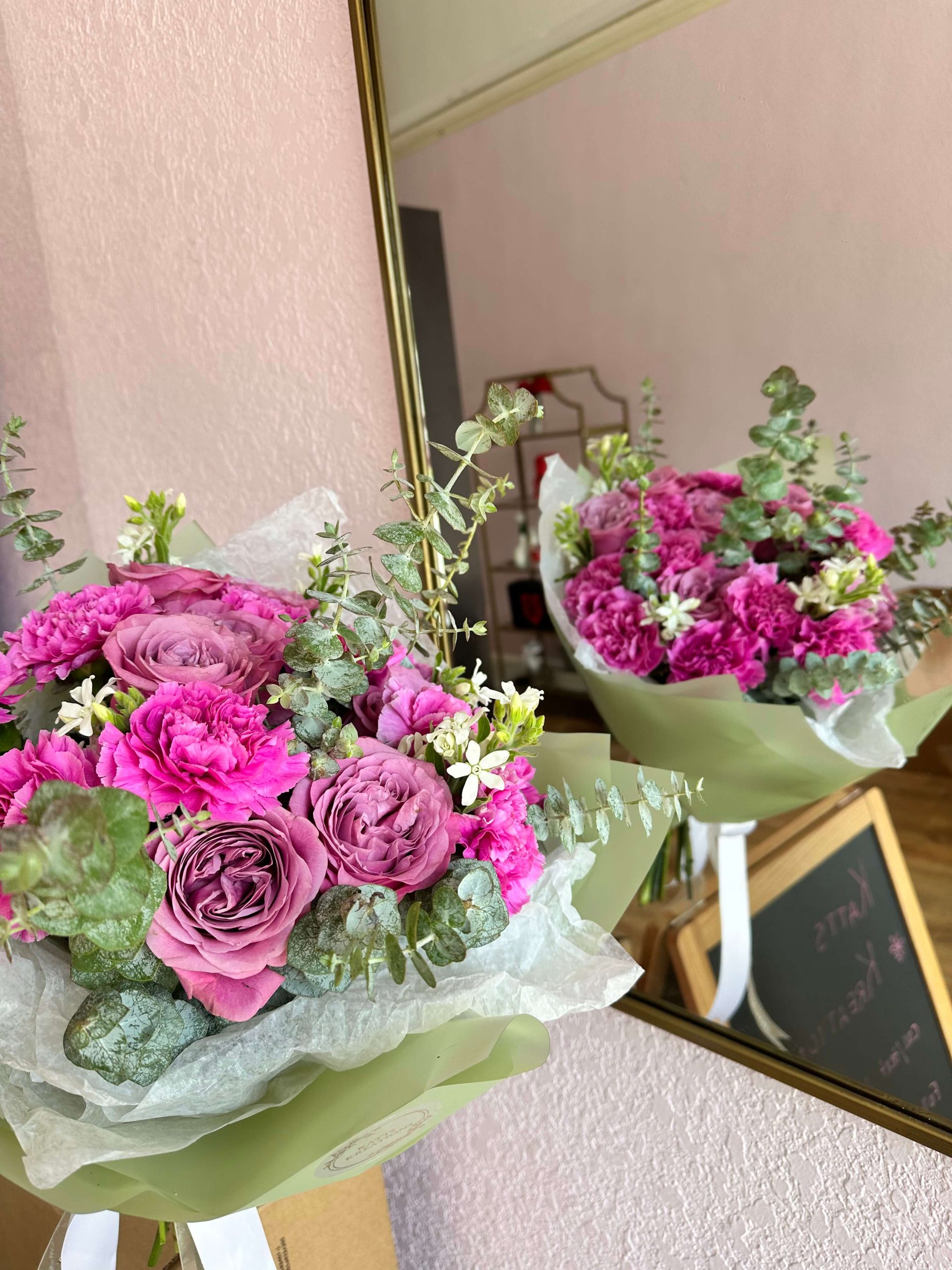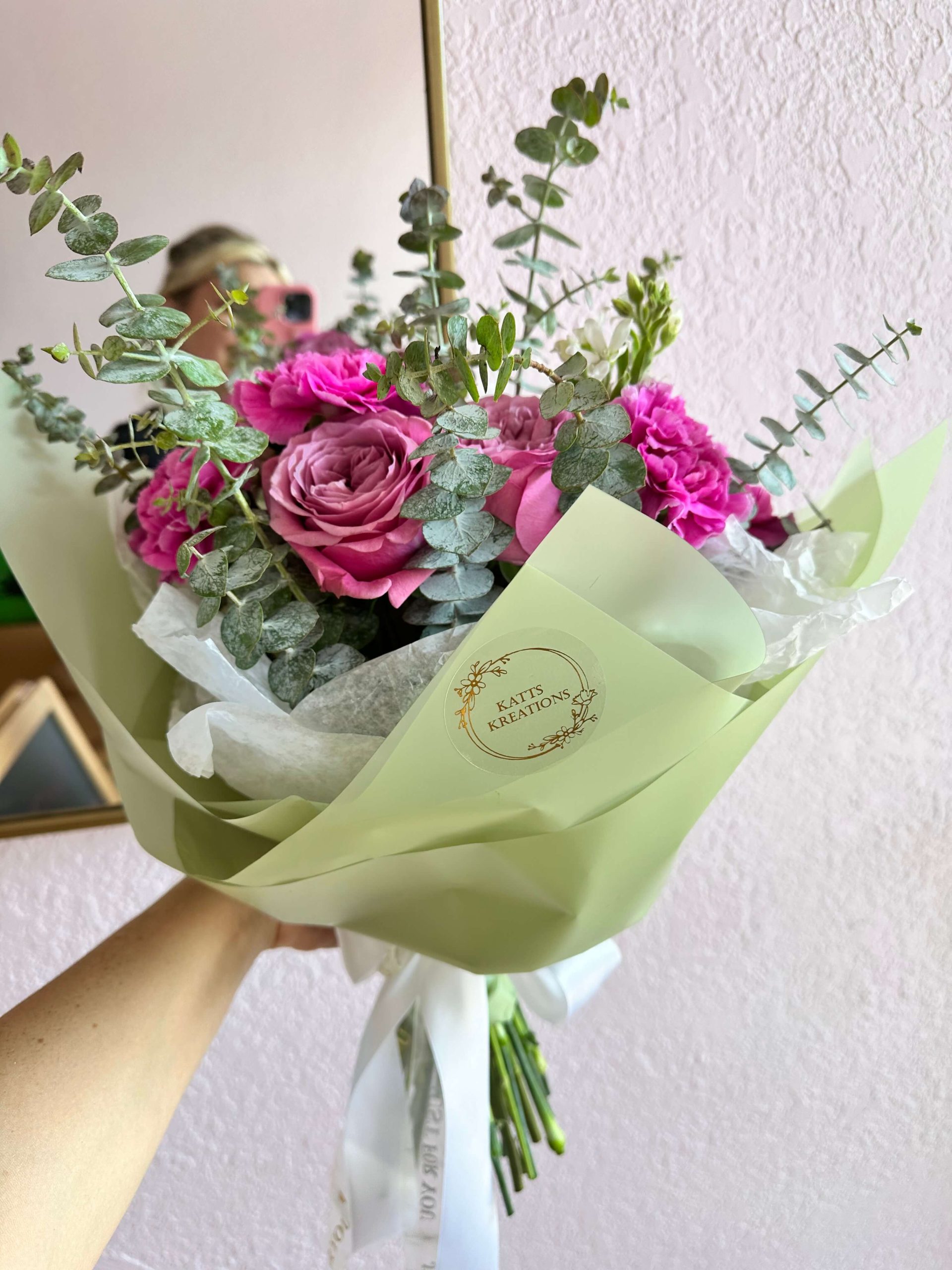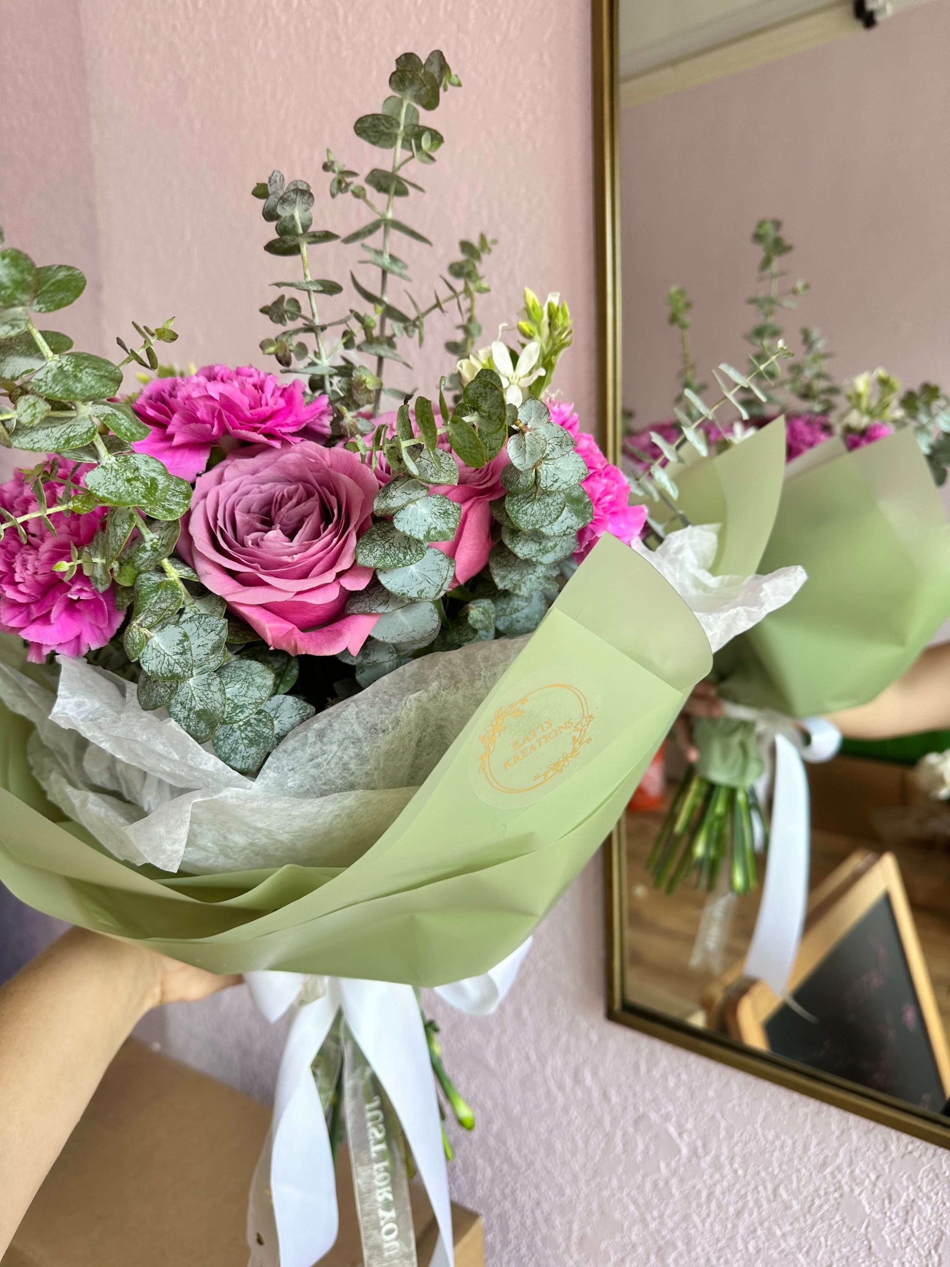 Hot pink carnation mixed with queen lace roses and a hint of eucalyptus. Comes with matching floral paper to complement the bouquet. Perfect gift for a birthday, anniversary, congratulations or a get well. Order yours today!