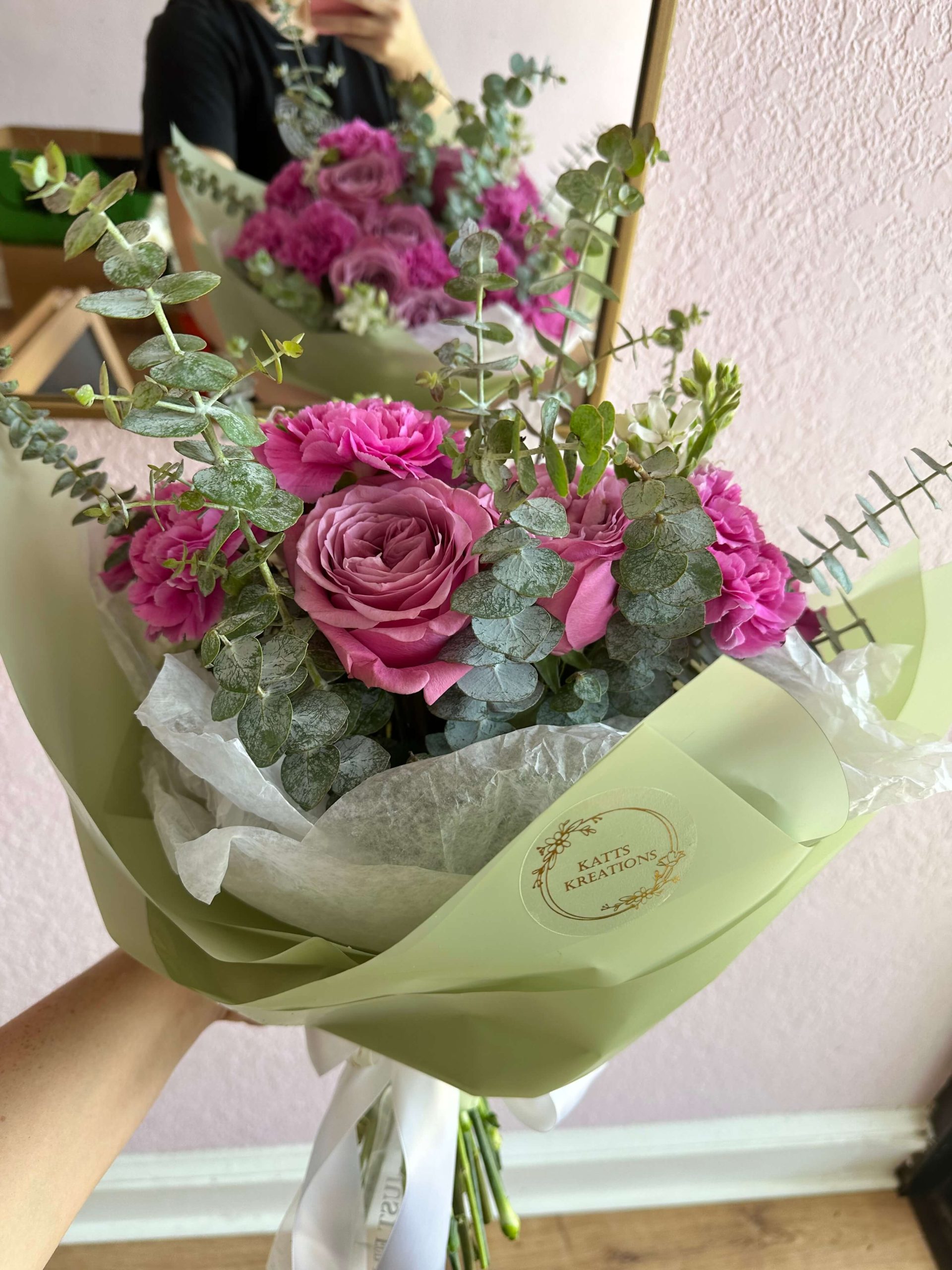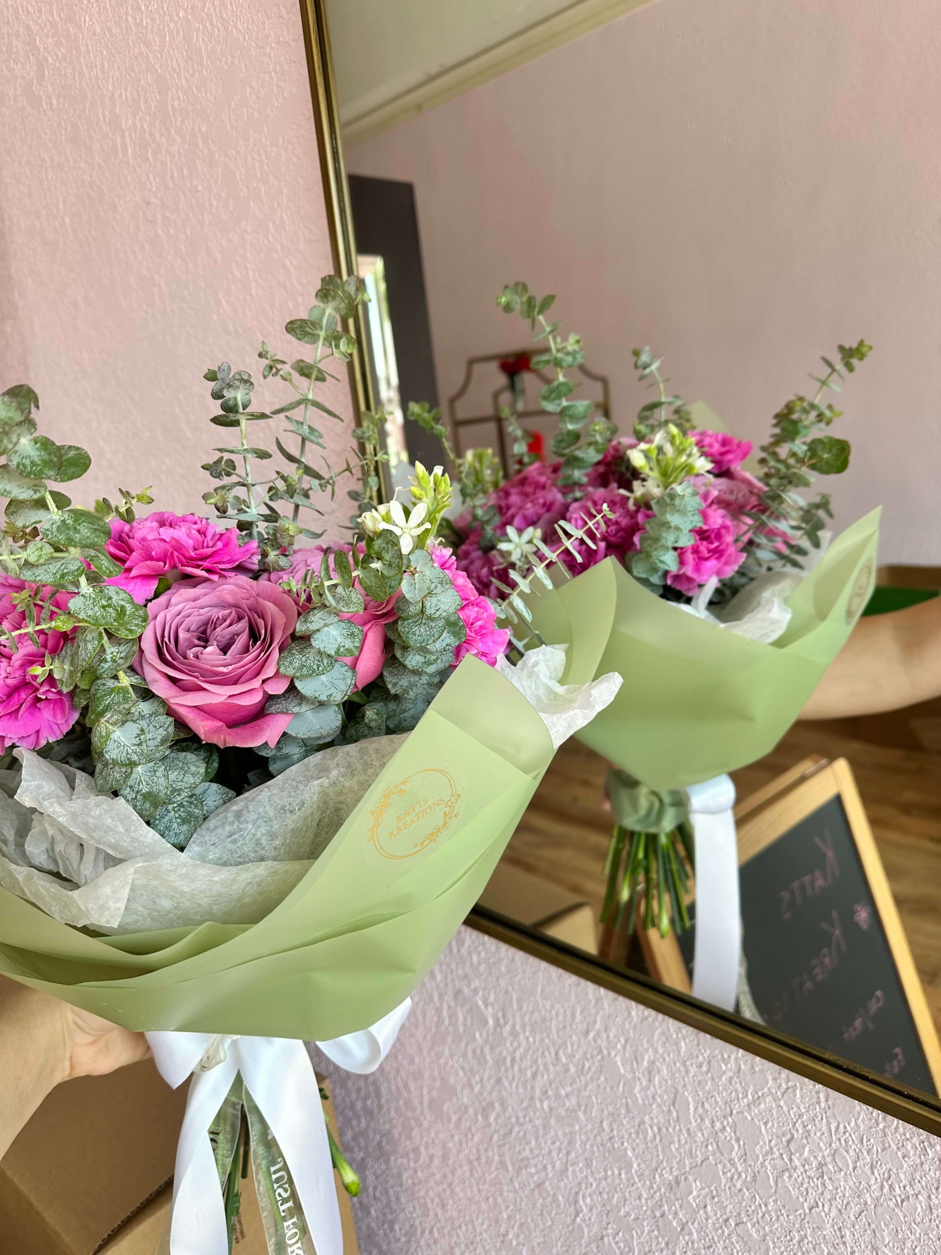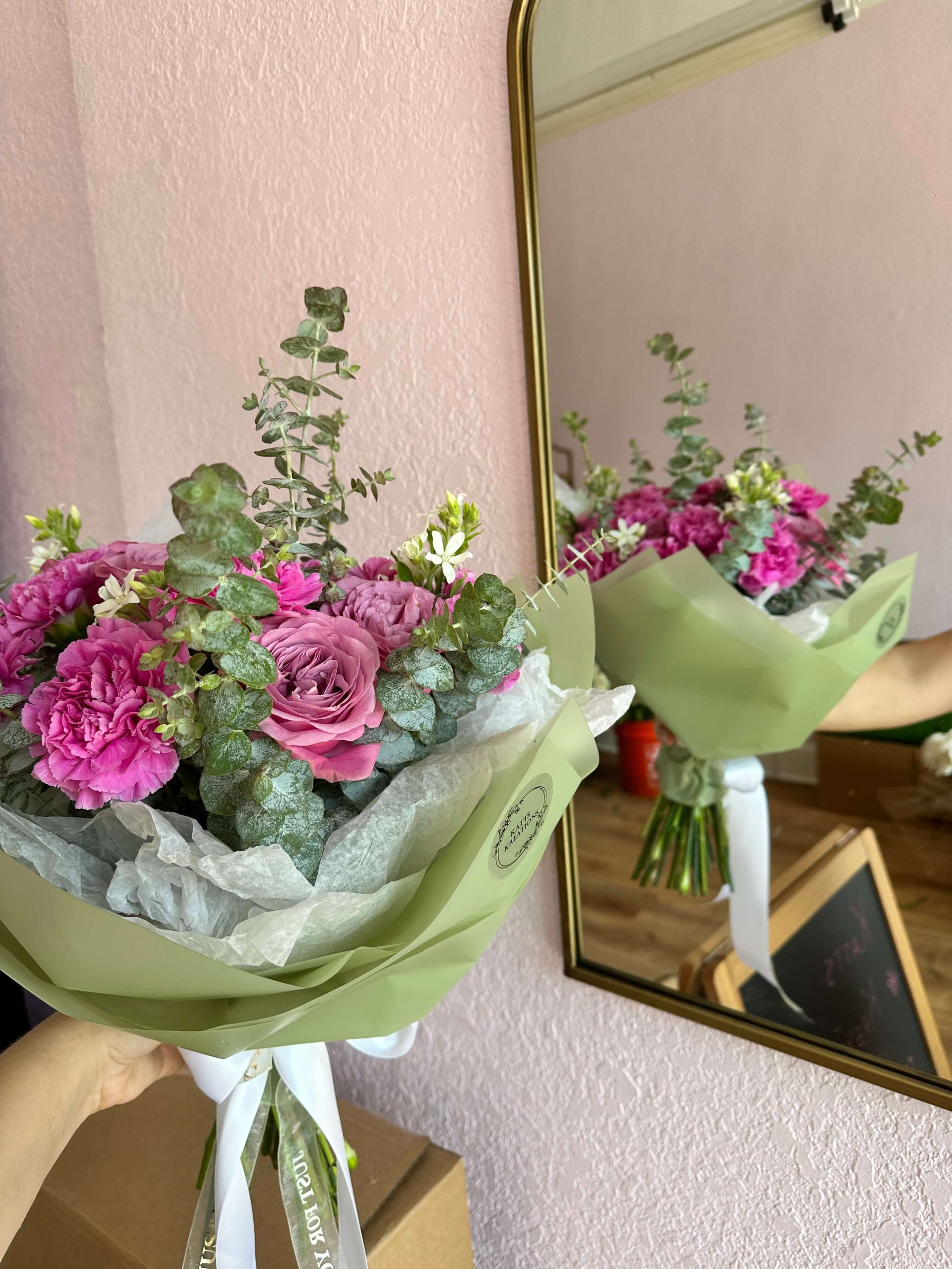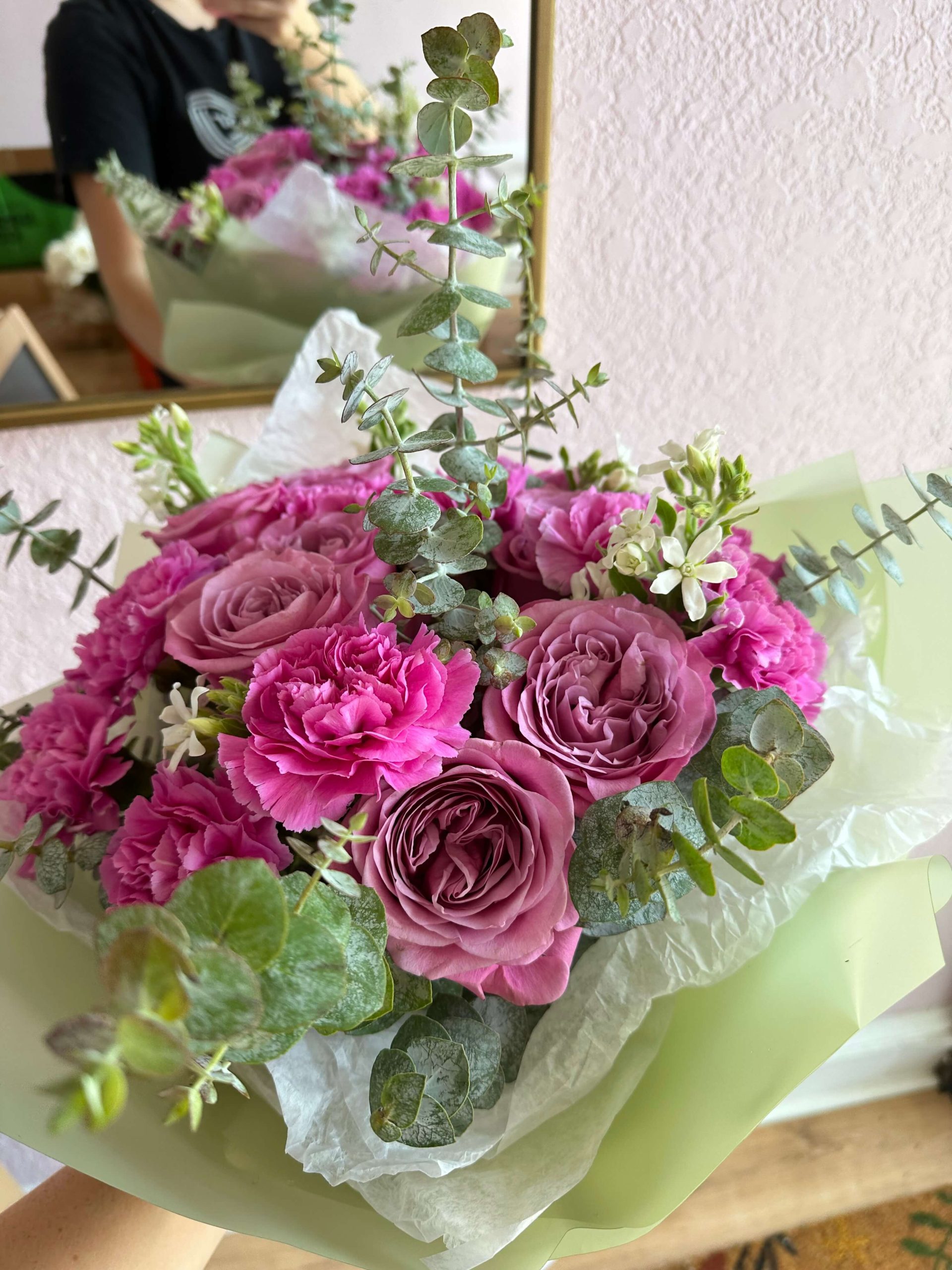 Hot pink carnation mixed with queen lace roses and a hint of eucalyptus. Comes with matching floral paper to complement the bouquet. Perfect gift for a birthday, anniversary, congratulations or a get well. Order yours today!